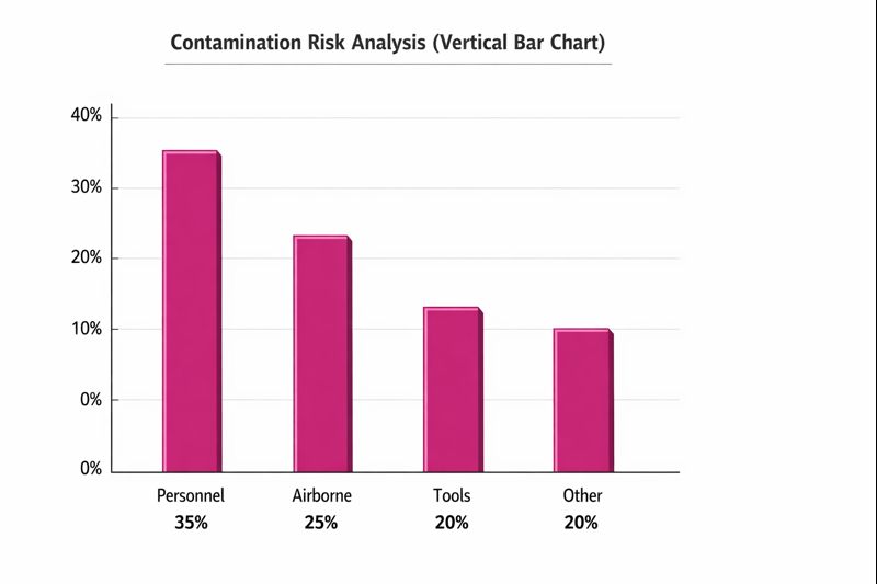 Det lodrette søjlediagram viser, at personalebevægelser bidrager mest til krydskontaminering i renrum, og lægger vægt på korrekt påklædning og håndtering af aftørring.