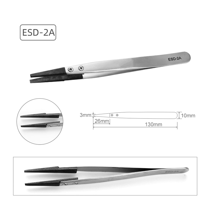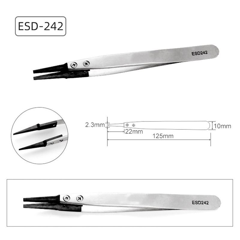 Pincethovedet er lavet af en blanding af kulfiber og speciel plast, som effektivt kan forhindre statisk elektricitetsakkumulering og tilvejebringe et sikkert driftsmiljø for statiske følsomme komponenter.