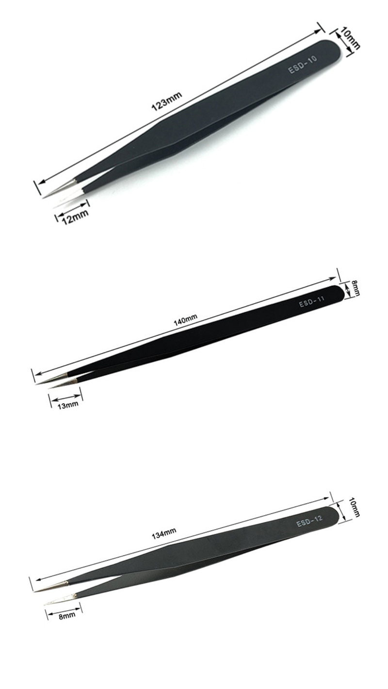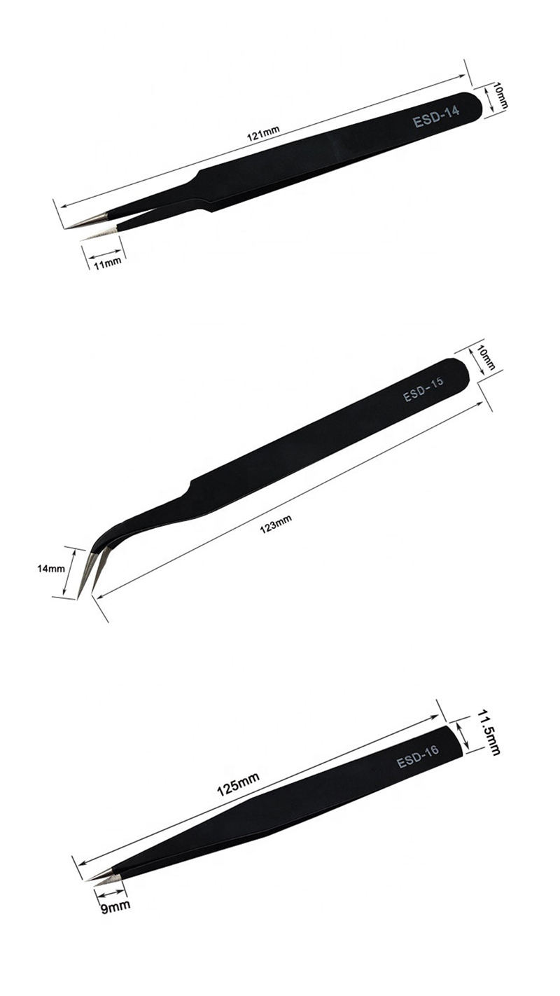 3. ESD-12 (høj elasticitet): Spidsen er fast og vil ikke bøje sig, selv når du klemmer kredsløbskortet kraftigt, hvilket sikrer, at delens sikkerhed.